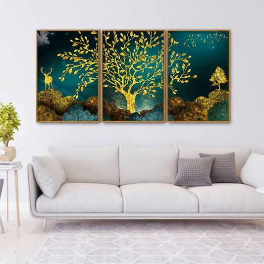 Golden Trees and Deer with Hills Premium Floating Canvas Wall Painting Set of Three